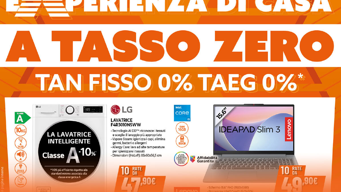 * Messaggio pubblicitario con finalit promozionale. Offerta valida dal 10/04/2025 al 21/04/2025, importo finanziabile da € 200 a € 5.000 – con finanziaria Agos importo minimo finanziabile € 320: paghi in 20 e 30 rate con prima rata a 30 giorni, come da esempi: prezzo del bene € 700, TAN fisso 0% TAEG 0% in 20 rateda € 35. Importo totale del credito e dovuto dal consumatore € 700. Prezzo del bene € 900, fisso 0% TAEG 0% in 30 rate da € 30. Importo totale del credito e dovuto dal consumatore € 900. Spese e costi accessori azzerati. Informazioni (IEBCC/SECCI) presso i punti vendita. Salvo approvazione della finanziaria prescelta, per cui Expert Italy opera quale intermediario del credito NON in esclusiva.