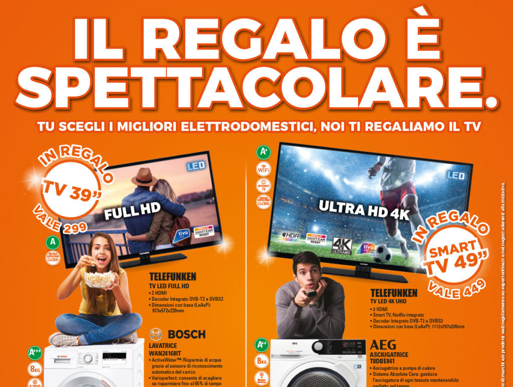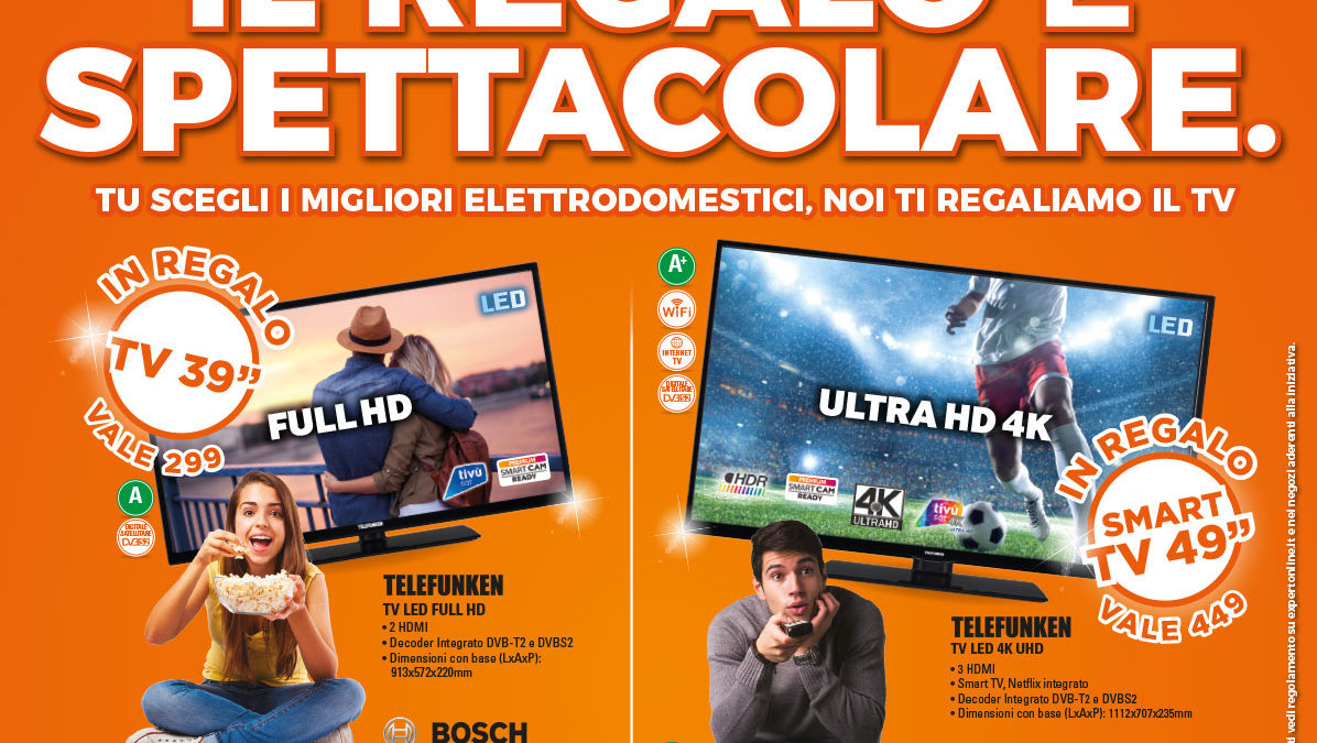 Questo mese, acquistando alcuni degli elettrodomestici in promozione tra frigoriferi, lavatrici e forni, ricevi in regalo un fantastico televisore.