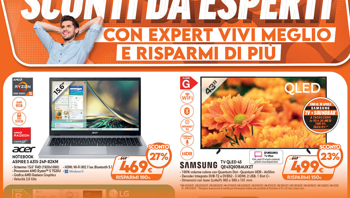 * Messaggio pubblicitario con finalit promozionale. Offerta valida dal 13/04/2023 al 26/04/2023, importo finanziabile da € 200 a € 5.000 – con finanziaria Agos importo minimo finanziabile € 320: paghi in 20 e 30 rate con prima rata a 30 giorni, come da esempi: prezzo del bene € 700, TAN fisso 0% TAEG 0% in 20 rateda € 35. Importo totale del credito e dovuto dal consumatore € 700. Prezzo del bene € 900, fisso 0% TAEG 0% in 30 rate da € 30. Importo totale del credito e dovuto dal consumatore € 900. Spese e costi accessori azzerati. Informazioni (IEBCC/SECCI) presso i punti vendita. Salvo approvazione della finanziaria prescelta, per cui Expert Italy opera quale intermediario del credito NON in esclusiva.