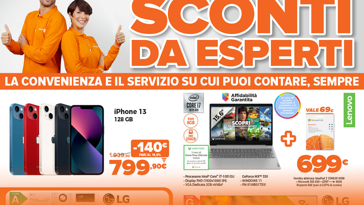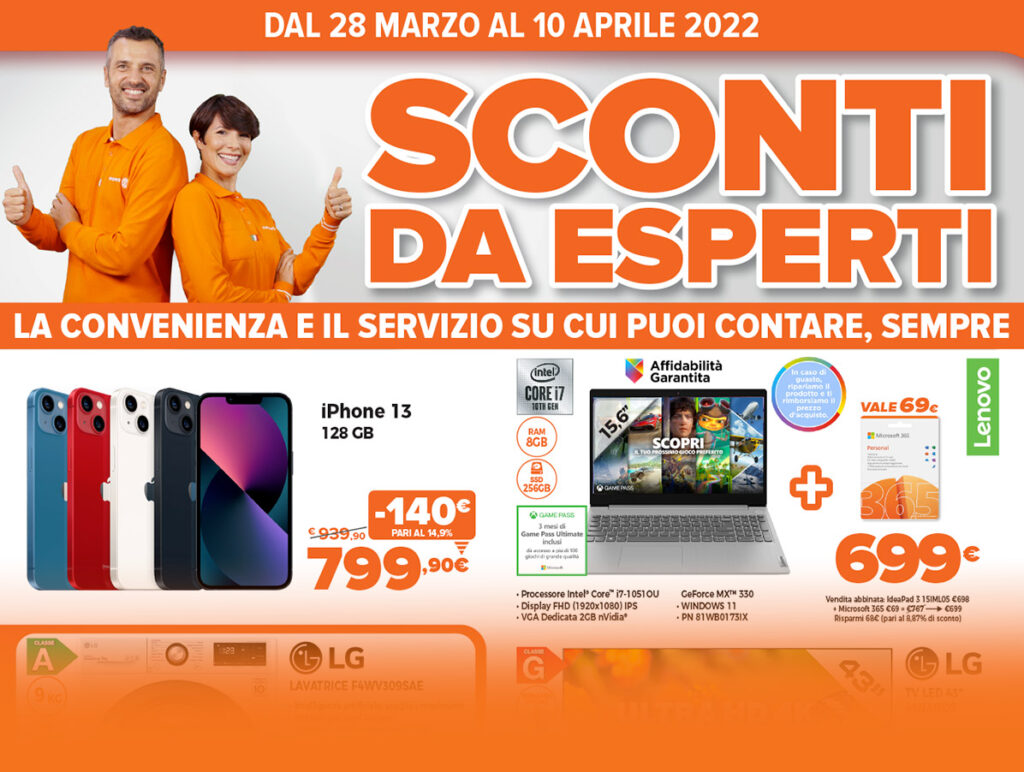 * Messaggio pubblicitario con finalit promozionale. Offerta valida dal 28/03/2022 al 10/04/2022, importo finanziabile da € 200 a € 5.000 – con finanziaria Agos importo minimo finanziabile € 320: paghi in 20 e 30 rate con prima rata a 30 giorni, come da esempi: prezzo del bene € 700, TAN fisso 0% TAEG 0% in 20 rateda € 35. Importo totale del credito e dovuto dal consumatore € 700. Prezzo del bene € 900, fisso 0% TAEG 0% in 30 rate da € 30. Importo totale del credito e dovuto dal consumatore € 900. Spese e costi accessori azzerati. Informazioni (IEBCC/SECCI) presso i punti vendita. Salvo approvazione della finanziaria prescelta, per cui Expert Italy opera quale intermediario del credito NON in esclusiva.