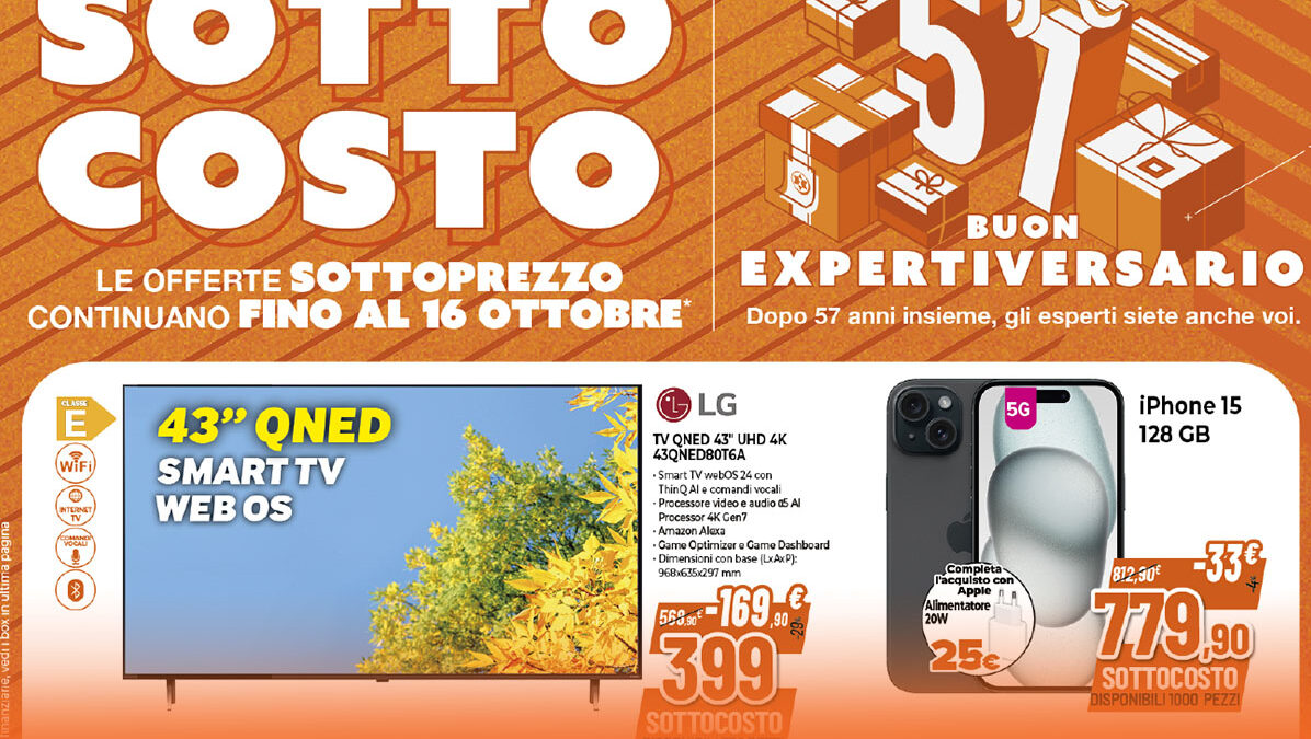 * Messaggio pubblicitario con finalit promozionale. Offerta valida dal 03/10/2024 al 12/10/2024, importo finanziabile da € 200 a € 5.000 – con finanziaria Agos importo minimo finanziabile € 320: paghi in 20 e 30 rate con prima rata a 30 giorni, come da esempi: prezzo del bene € 700, TAN fisso 0% TAEG 0% in 20 rateda € 35. Importo totale del credito e dovuto dal consumatore € 700. Prezzo del bene € 900, fisso 0% TAEG 0% in 30 rate da € 30. Importo totale del credito e dovuto dal consumatore € 900. Spese e costi accessori azzerati. Informazioni (IEBCC/SECCI) presso i punti vendita. Salvo approvazione della finanziaria prescelta, per cui Expert Italy opera quale intermediario del credito NON in esclusiva.