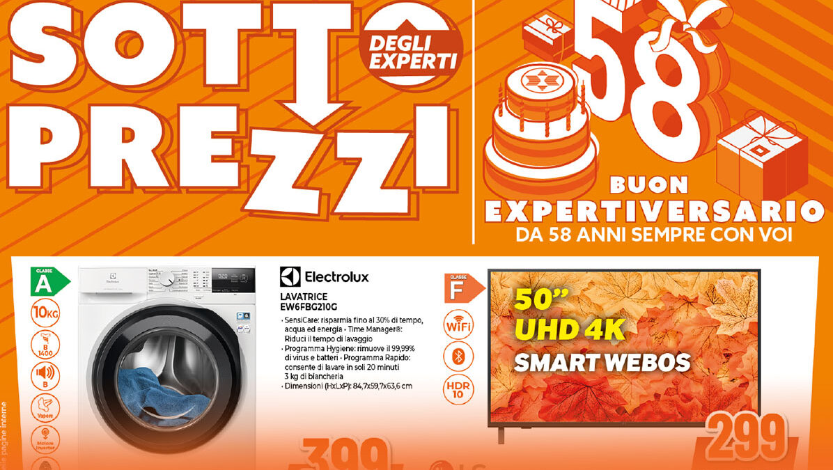 * Messaggio pubblicitario con finalità promozionale. Offerta valida dal 02/10/2025 al 15/10/2025, importo finanziabile da € 200 a € 5.000 – con finanziaria Agos importo minimo finanziabile € 320: paghi in 20 e 30 rate con prima rata a 30 giorni, come da esempi: prezzo del bene € 700, TAN fisso 0% TAEG 0% in 20 rateda € 35. Importo totale del credito e dovuto dal consumatore € 700. Prezzo del bene € 900, fisso 0% TAEG 0% in 30 rate da € 30. Importo totale del credito e dovuto dal consumatore € 900. Spese e costi accessori azzerati. Informazioni (IEBCC/SECCI) presso i punti vendita. Salvo approvazione della finanziaria prescelta, per cui Expert Italy opera quale intermediario del credito NON in esclusiva.